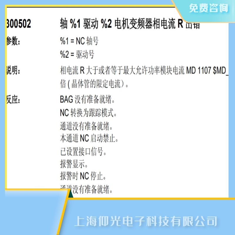 上海仰光電子科技有限公司維修面向全國,提供免費檢測,免費咨詢,有測試平臺,同一故障六個月質保,修不好不收費用,如有任何故障可隨時聯系我們,工程部溫馨提示:如果設備出現報警或者損壞,不是專業技術人員請勿私自拆卸,以防帶來安全隱患以及給設備造成二次傷害.上海仰光電子-您身邊的設備維修維護專員.關于常州西門子SIEMENS840c數控系統維修,西門子報300502故障報警代碼維修的技術問題上海仰光電子提供24小時免費咨詢服務.